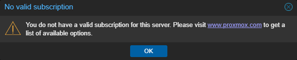 - The first thing you will see is a warning message stating that you do not have a valid subscription for your server. This is expected since we are using Proxmox for personal use and don’t have an enterprise subscription. Simply ignore this message and click OK for now, we will disable this message later.