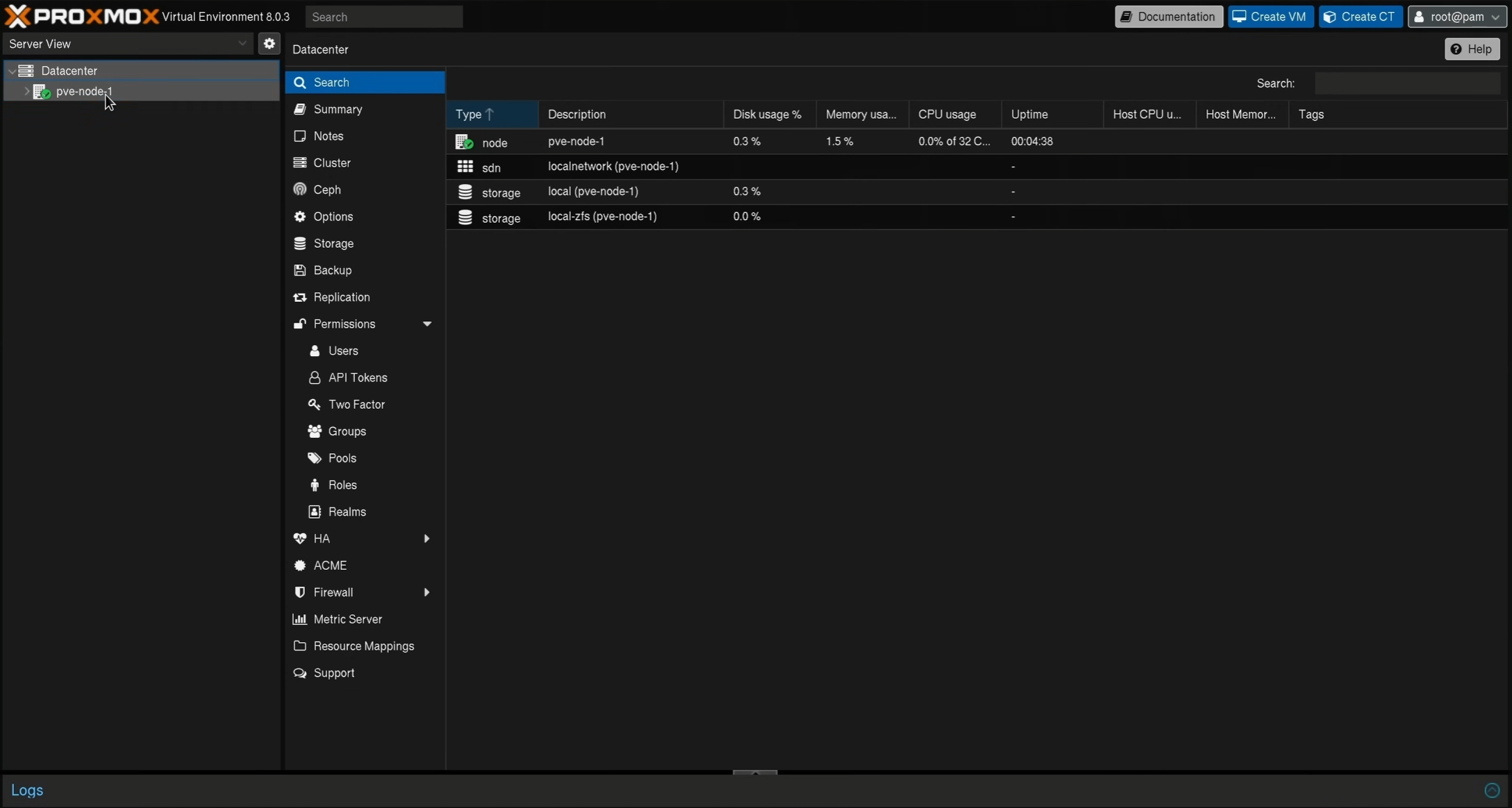 - Under “Datacenter”, you should see a single node listed with the hostname you chose during the installation process (in the example below, it is “forge”)